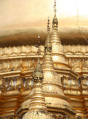 Imaginez des villes, villages et paysages où partout l'or arrête le regard : des temples et des stupas, des zedis, des payas comme autant de brillants joyaux qui se révèlent au fur et à mesure de la traversée du pays. Imaginez des lieux de recueillement, des centaines de statues et de sanctuaires blancs, ocres, rouges et bruns et autant de cônes d'or qui tendent vers le ciel, un endroit hors du monde où les pèlerins se suivent, où l'on reste pour observer et écouter, où chaque pas porte vers de nouveaux détails et de nouveaux mystères. Imaginez des monastères et des moines qui prient, des bouddhas couchés ou assis, des croyants qui parcourent à pieds nus ces lieux sacrés, s'y recueillent et recouvrent de feuilles d'or des statues déjà bien adorées.