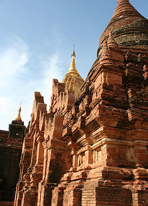 Et l'or n'est pas que d'or : dans la brique et la pierre aussi on trouve de ces trésors, comme à Bagan, une étendue immense qui s'étire au soleil, où partout s'expriment les vestiges de temples. Des ruines chargées de temps, des milliers de bâtiments tranquillement installés au bord de la rivière ou au milieu des champs. Chaque jour de promenade réserve des surprises, on se perd à vélos et on ouvre la voie à des mondes de secrets, on grimpe sur certains temples pour voir se révéler de sublimes points de vue, on admire le soleil se coucher et éclairer cette plaine parsemée de chef-d'uvres. |