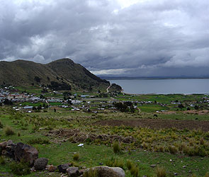 Le lac Titicaca. Etendue d'huile immense bordée de collines vertes,