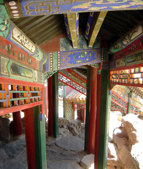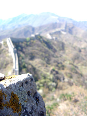 | L'immensité du territoire va de pair avec la masse de touristes chinois qui visitent eux aussi ces sites. Difficile de trouver un instant de répit face à cette agitation frénétique de hordes pressées, bruyantes et crachant, généralement menées par un guide à drapeau et porte-voix, non moins pressé et bruyant. Notre escalade de la Grande Muraille est un instant d'autant plus magique que nous sommes quasiment seuls à parcourir l'édifice. Un rêve d'enfant qui ne sera pas déçu : le panorama de la muraille avec ses tours de garde s'étirant à perte de vue suivant le relief de la montagne est d'une beauté à couper le souffle. Pour un peu, on verrait presque surgir des broussailles l'armée mongole de Genghis Khan, attaquer et franchir la muraille à grands renforts de pics et de cris. Après tout, "la force d'une muraille dépend du courage de ceux qui la défendent"... |