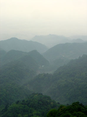L'effort consenti pour gravir les montagnes sacrées, pour sortir des sentiers battus et s'éloigner des hordes de touristes, est largement récompensé par la vue des sommets disparaissant sous la brume. Un alignement de pentes boisées à perte de vue, une promenade entre ciel et nuages qui permet de retrouver pour quelques temps un silence absolu. Nous nous arrêtons pour observer ce paysage déjà vu en photos et sur les estampes chinoises, et ne boudons pas notre plaisir à découvrir la réalité des détails de ces clichés que nous avions en tête, à admirer les nuances de bleus, de verts et de gris qui forment le paysage, et même à sourire lorsqu'une fine pluie se met à tomber, elle qui s'accorde si bien avec l'environnement en cet instant précis ! |