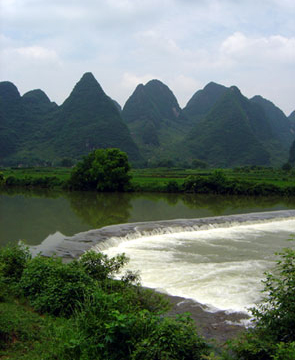 Reliefs karstiques : paysages idylliques Une rivière, de longues barques de bois, des hommes à chapeau conique, de la brume et au loin, un relief surprenant : une succession de pics qui semblent être sortis de terre subitement. Nos étapes à Guilin et Yangshuo nous permettent de découvrir un paysage jamais vu jusqu'alors. Une promenade à bicyclette à travers les champs et les rizières nous donne l'occasion de profiter encore mieux de cette nature hors du commun. Partout autour de nous s'étirent ces collines aux parois verticales, recouvertes de dense végétation.