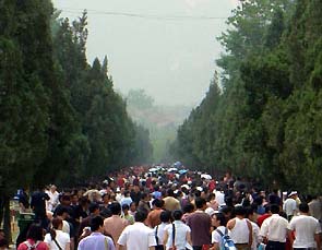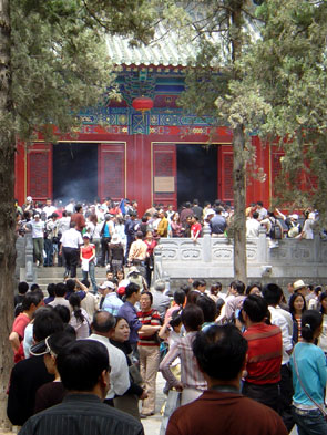 Quand le Chinois devient touriste ! Le nombre n'arrangeant en rien les comportements souvent surprenants de nos amis Chinois, le tourisme de masse devient une expérience typique en tant que telle dès lors qu'on commence à visiter des sites historiques… Lors de nos découvertes de lieux culturels, nous nous retrouvons très souvent face à des groupes de touristes qui forment autant d'équipées sauvages, organisées en régiments, débarquant de leurs bus climatisés pour prendre d'assaut l'objectif assigné. Ces fantassins font le tour de la place forte au pas de course, menés tambour battant par un guide d'une efficacité redoutable, armé d'un drapeau coloré et qui hurle ses explications au moyen d'un porte-voix, même lorsque le groupe n'excède pas cinq personnes. |