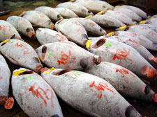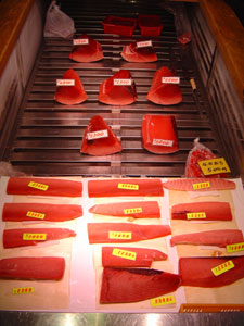 L'un de nos meilleurs souvenirs de Tokyo reste celui de notre visite du marché aux poissons de Tsukiji. Un lever à 4h00 du matin pour être sur place dès 5h30, afin d'assister aux enchères du marché de gros. L'accès aux salles où sont exposés les thons et autres gros poissons, impressionnants dans leur alignement artificiel, n'est pas autorisé, mais les portes restent ouvertes et nous pouvons assister au spectacle. Une agitation frénétique, une bousculade ritualisée… le temps pour les acheteurs d'examiner la qualité des prises du jour, et en quelques minutes les enchères sont faites, dans un tintamarre de cris, de voix, de sons de cloches, de bruits des machines et d'annonces des enchères. Des chiffres annoncés par des hommes en bottes qui sont pour nous autant d'onomatopées exaltées. Une fois la vente aux enchères terminée et les poissons repartis sur des brancards de bois, retour à un calme tout relatif. La promenade dans les allées du marché nous permet de découvrir des espèces dont nous ne soupçonnions pas l'existence. Après deux heures de déambulation dans les allées trempées, c'est l'heure du petit déjeuner : poissons crus, sushis et sashimis on ne peut plus frais, dégustés sur place, sur un coin de table…un instant de répit qui vaut un bout de paradis… |